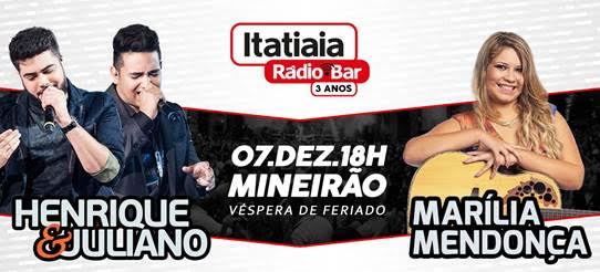 O Itatiaia Rádio Bar completa três anos e promove, mais uma vez, uma grande festa para comemorar o seu aniversário. No dia 7 de dezembro, quarta-feira, véspera de feriado, a partir das 18h, a Esplanada do Mineirão (Av. Antônio Abrahão Caram, 1001, Pampulha) será palco para a dupla que arrasta multidões, Henrique e Juliano, e a cantora mais tocada nas rádios de todo o país, Marília Mendonça.